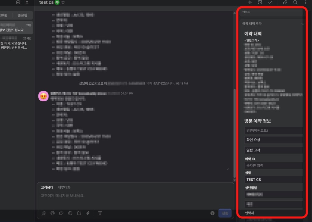 예약 메시지가 오면 시트 보면서 옮겨적을 필요없이 채널톡 화면에서 바로 예약 정보 확인하고 예약 추가/업데이트를 할 수 있다.