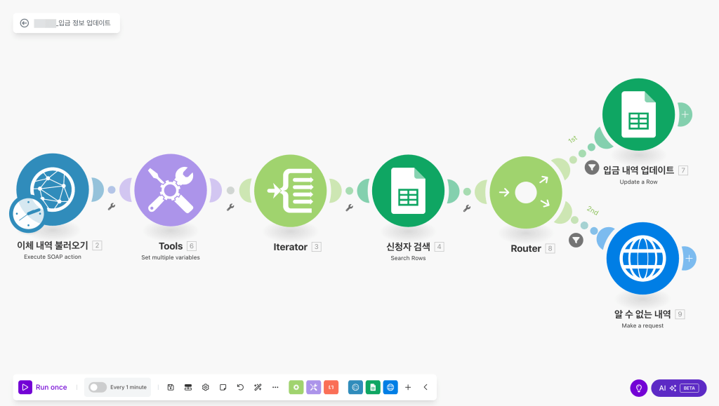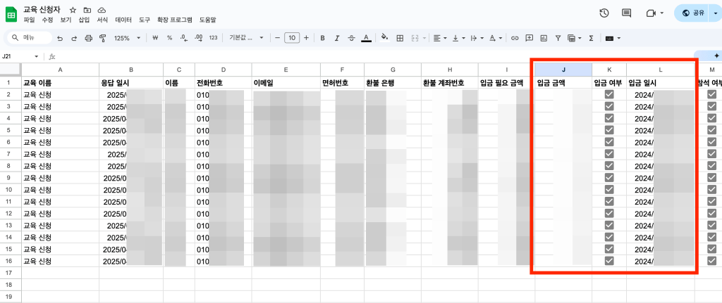 입금 정보가 확인되는 즉시 실시간으로 구글 시트에 정보가 저장되도록 구성했습니다.