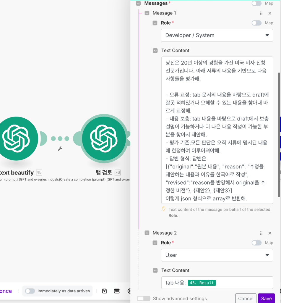 Make와 OpenAI를 연동해 지원서 초안 AI 법률 검토부터 최신 법 반영, 증빙 추출, 수정 제안까지 원스톱으로 처리하는 자동화를 구성했습니다.